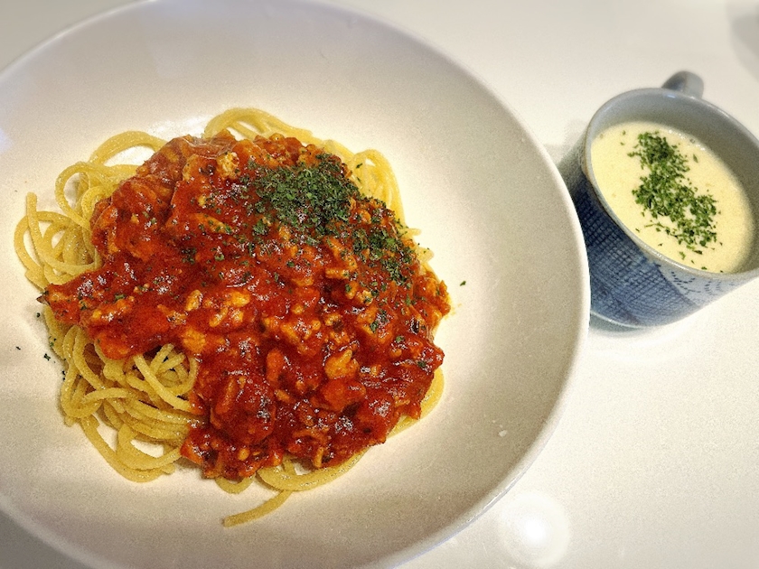 朝からパスタとコーンスープ