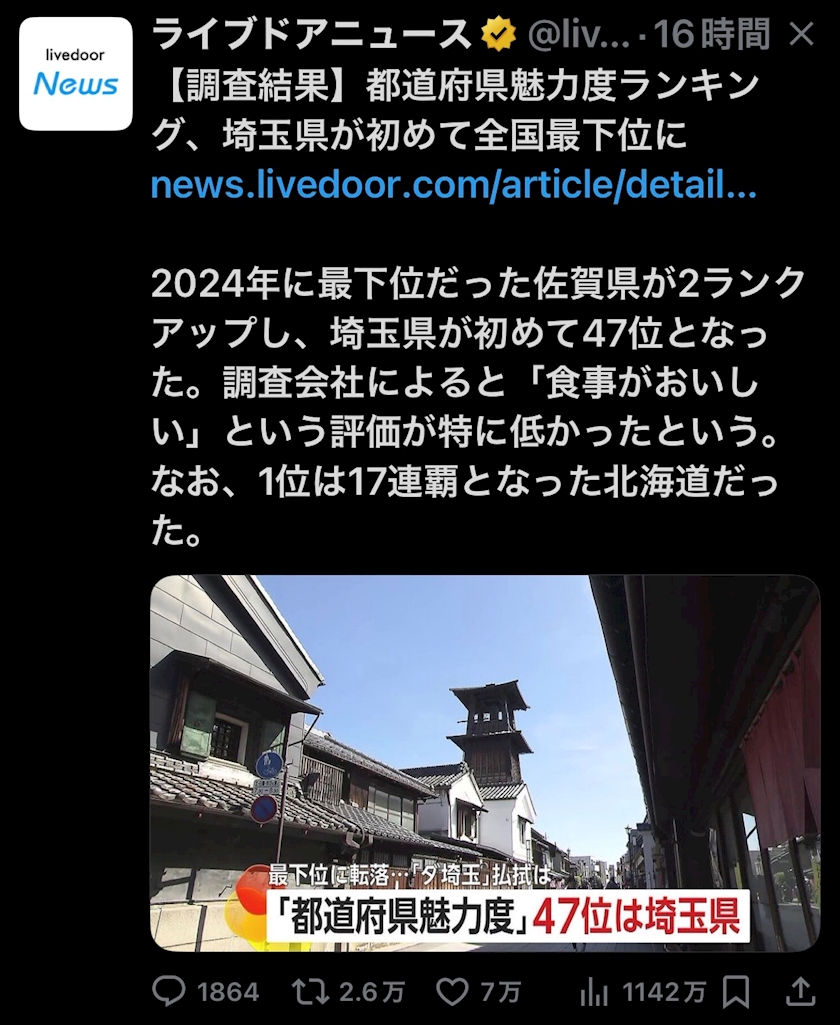 埼玉ついに最下位⁉️⁉️⁉️