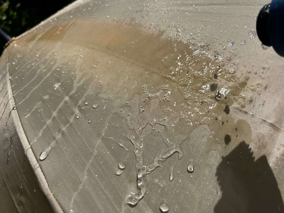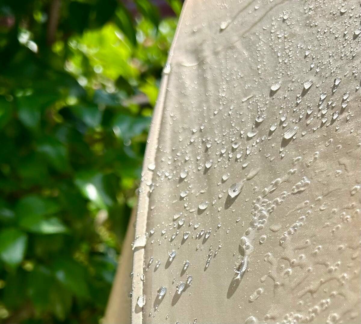 傘に付着した水分がするすると落下しているのがわかるでしょうか……。110円でここまで撥水するなんて!