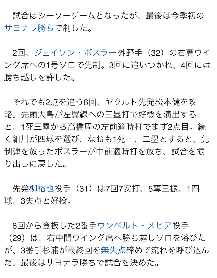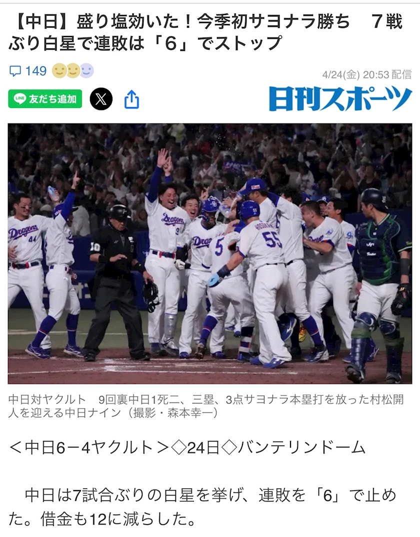 中日がサヨナラ勝ちしたらしく