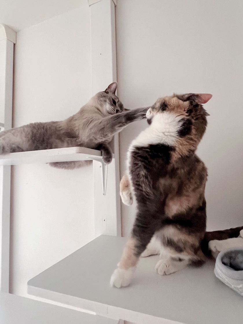 動画は場所の取り合いでケンカする兄妹猫ww