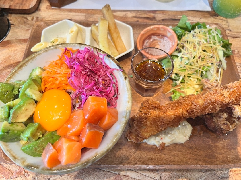 選べるミニ丼に、エビフライ・唐揚げ・ポテト・サラダがついたセット💚