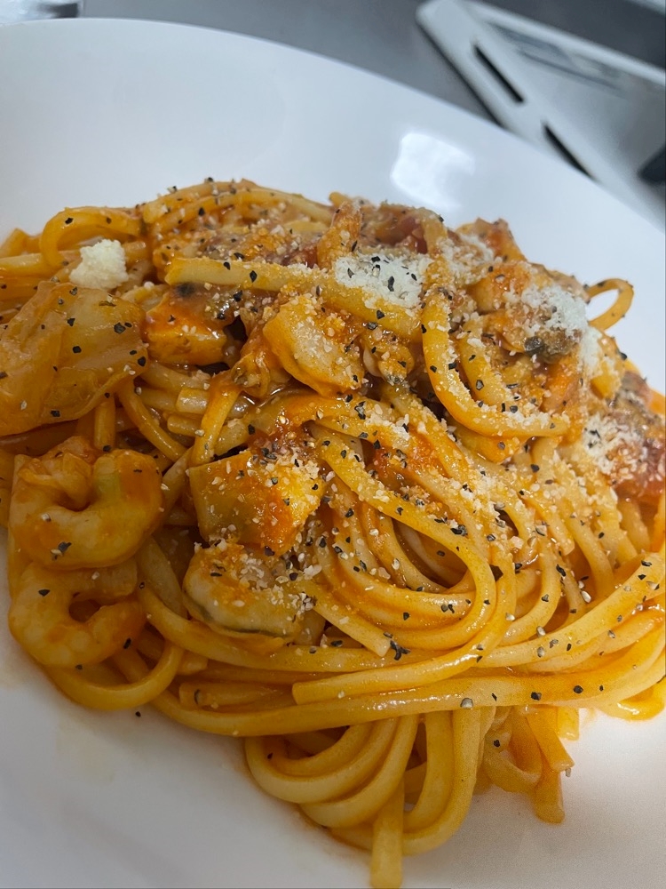 とったとこの電気が白だったからあんまりよく見えんのやけど、シーフードトマトパスタ