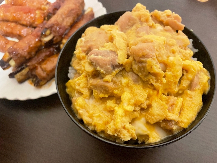 【親子丼とエノキとナスの肉巻き】