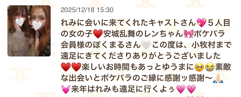 - 大人の遠足🤍in安城🤍乱舞レンちゃん🤍お誕生日祝いしてきたよぅ♥️🎂ブログ書いてたらまた余韻が🤭💕ポケパラのご縁に感謝♥️仲良くしてくれるレンちゃんも葵ママもポケパラ会員様もみんなに感謝ッ🥹💖💖みんなだいすきーッ♥️♥️♥️♥️