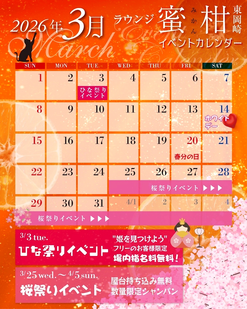 3月のカレンダー🍊🍊 - 黒服ふく - ラウンジ 蜜柑・ラウンジ ミカン - 岡崎のクラブ/ラウンジ