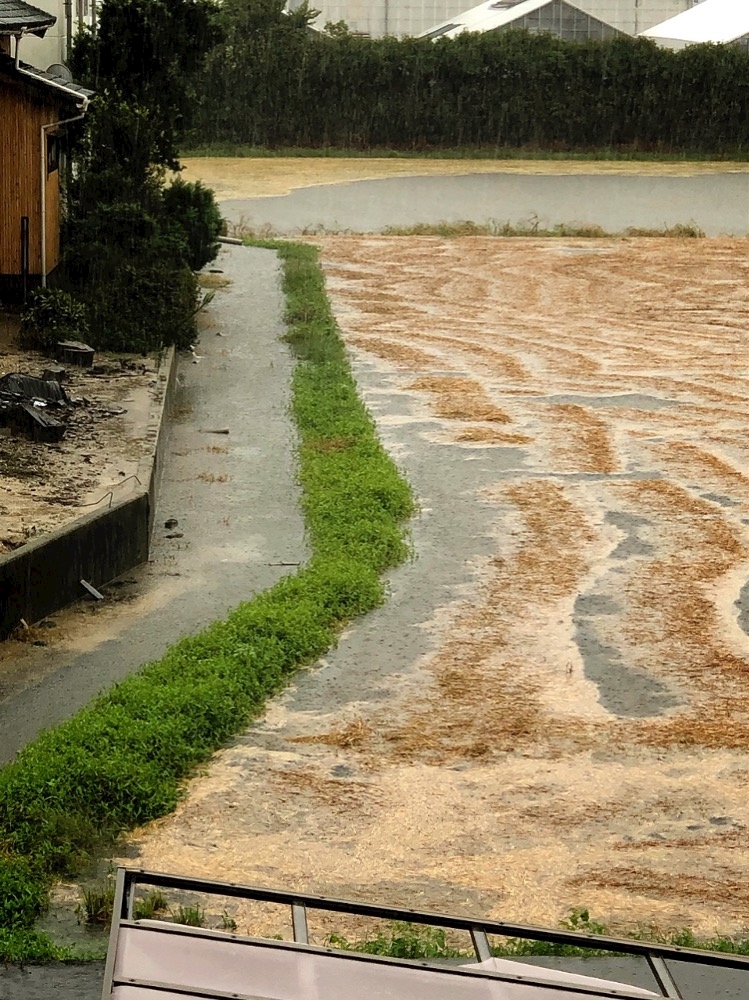 田んぼと川の水が溢れ出して