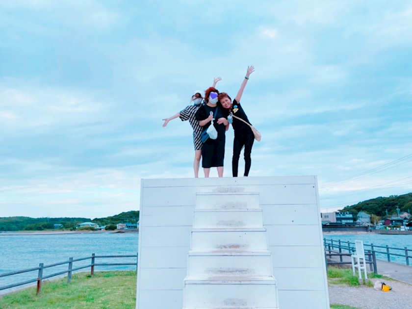 海をバックに