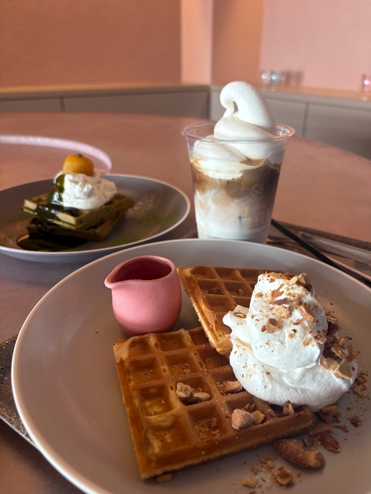 ワッフル食べておいしいカフェオレフロートを飲みながら、足湯😆