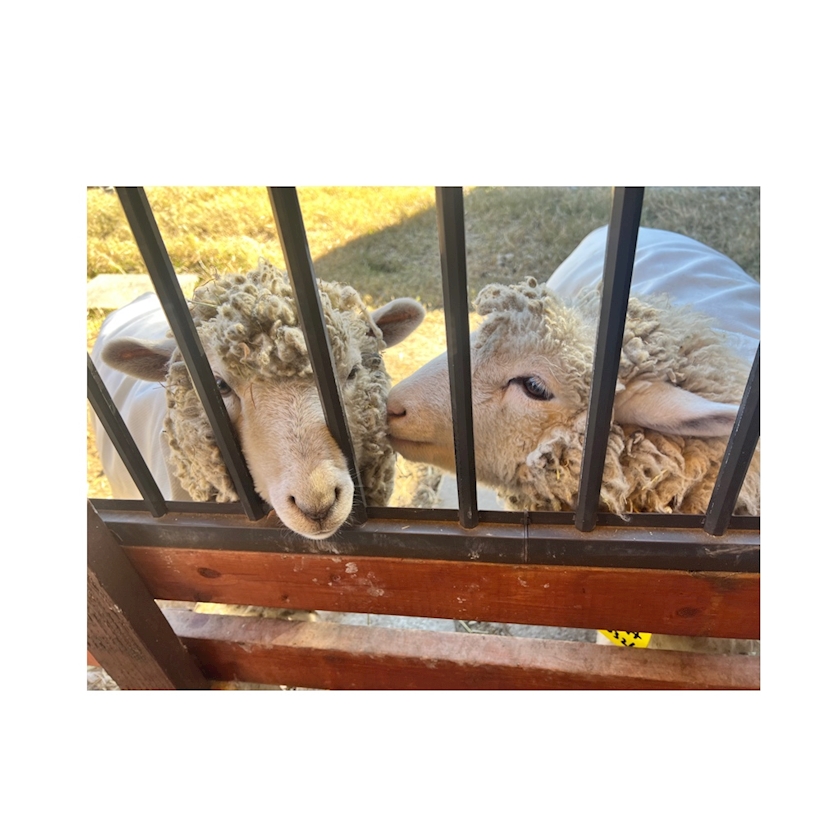 左のヤギが食べてくる草を