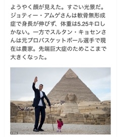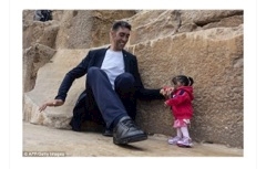 エジプトのピラミッドの前で世界一身長の高い男性と