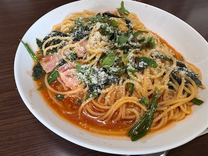 お昼ご飯魚介風味のトマトパスタ作った🍝