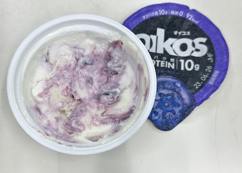 ただのオイコスじゃなくて、冷凍庫で凍らしてレンジで少し溶かしてジャリジャリで食べてるの‼️