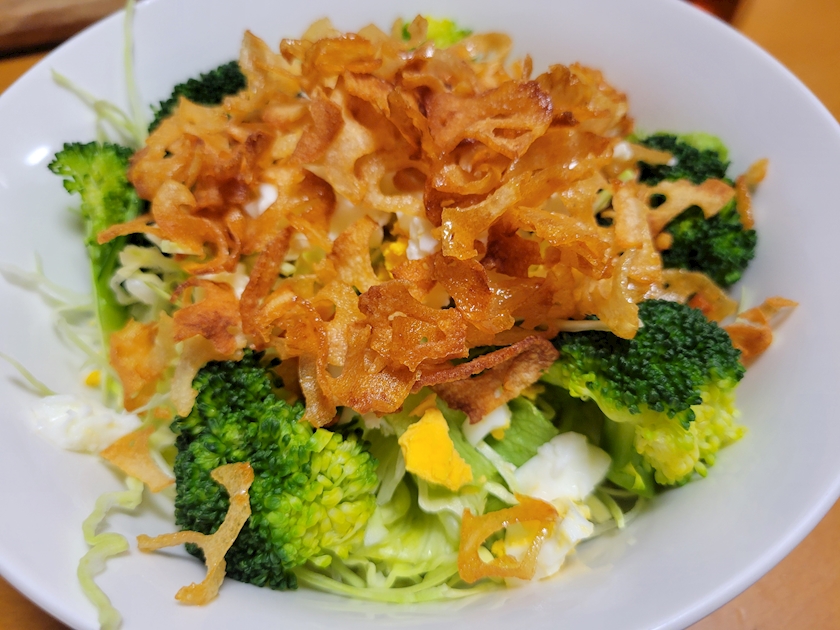 サラダにゆで卵崩したのと