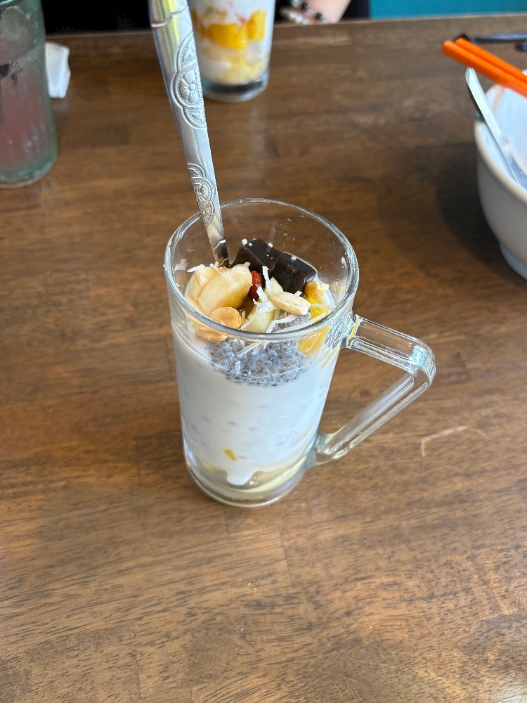 パイン🍍マンゴ、ライチ、タピオカ、チアシード、ナタデーココ、ナッツ🥜が入ってます。