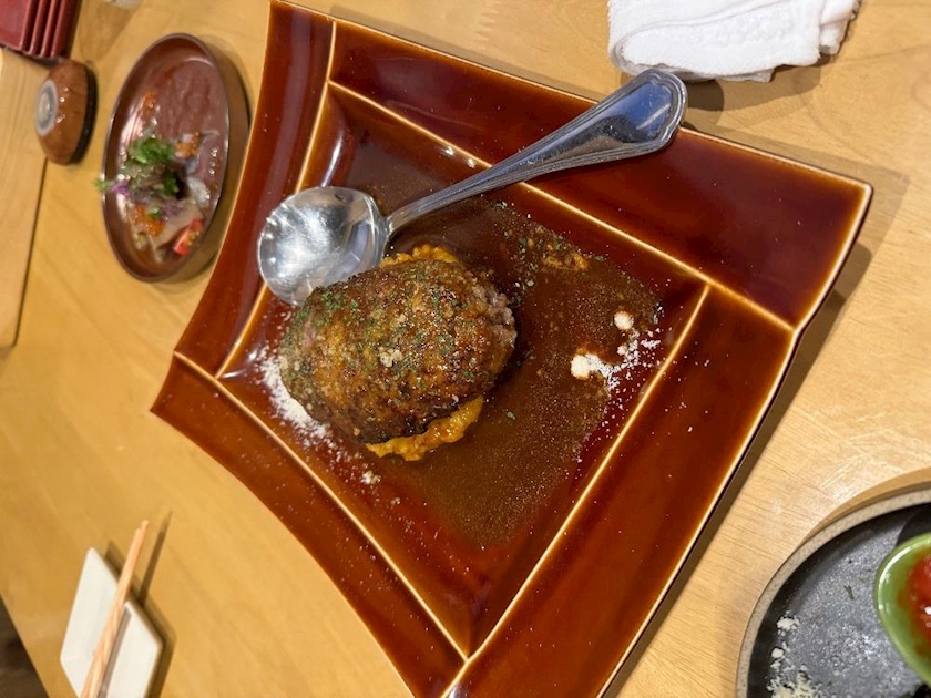 ハンバーグ国産牛だから半焼き?(ミディアムレア)でうまうまでした〜🥩