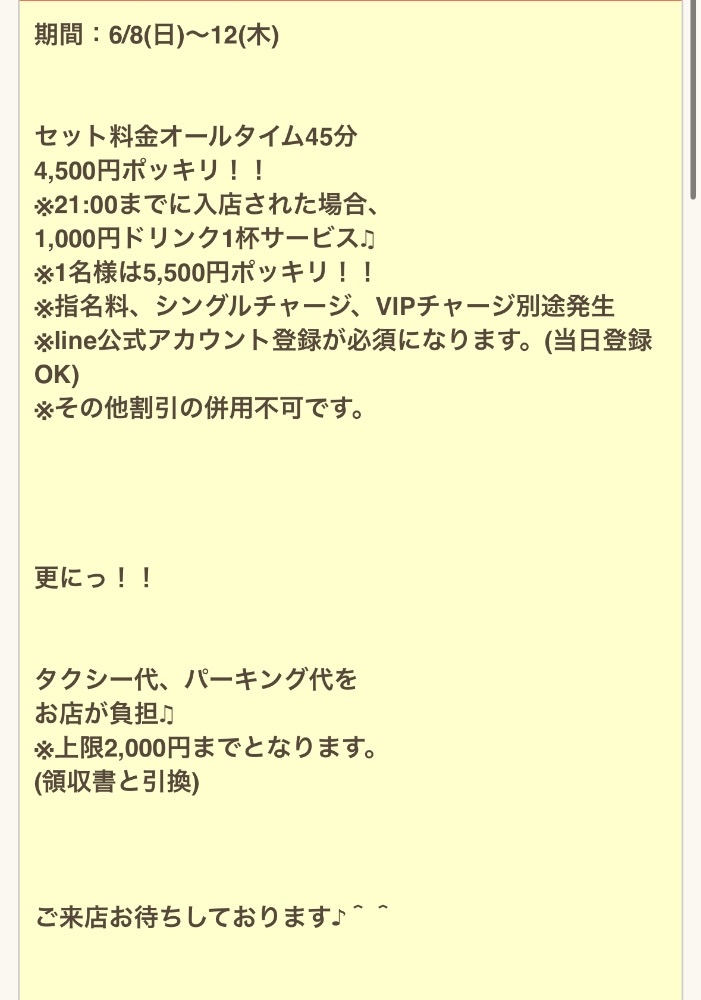 タクシー代パーキング代も2000円までもらえるからお店が負担してくれるから、領収書忘れずに持ってきてね☺️👌