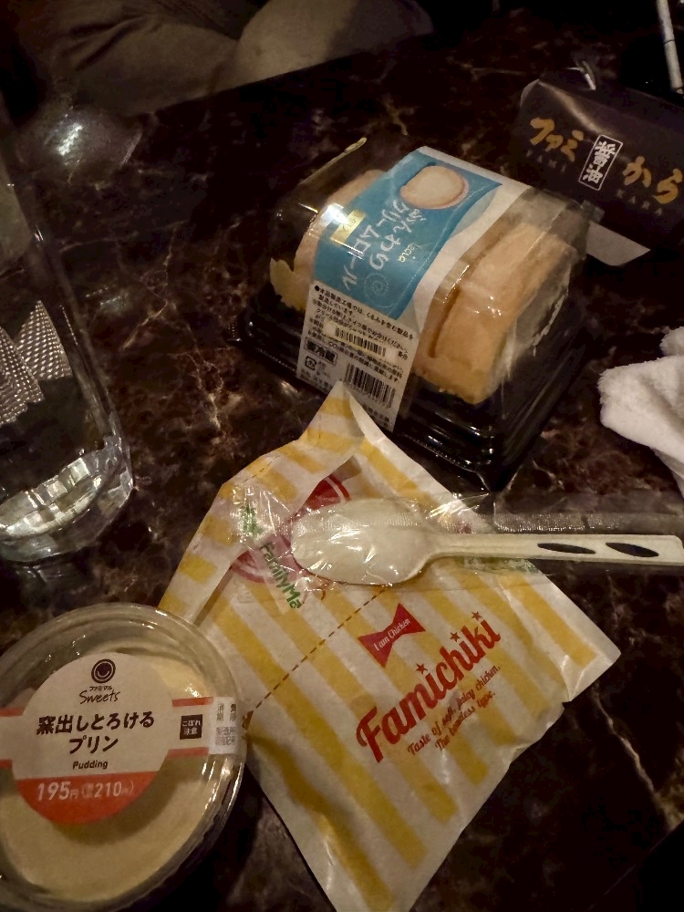 ファミチキと唐揚げとプリンとロールケーキ買ってきてくれたー
