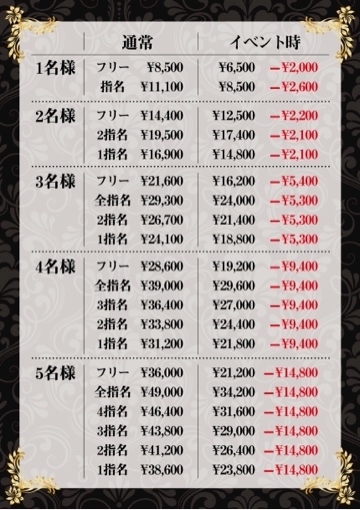 (同伴、本指名、場内指名、ドリンクバック、ボトルバック、フードバック)