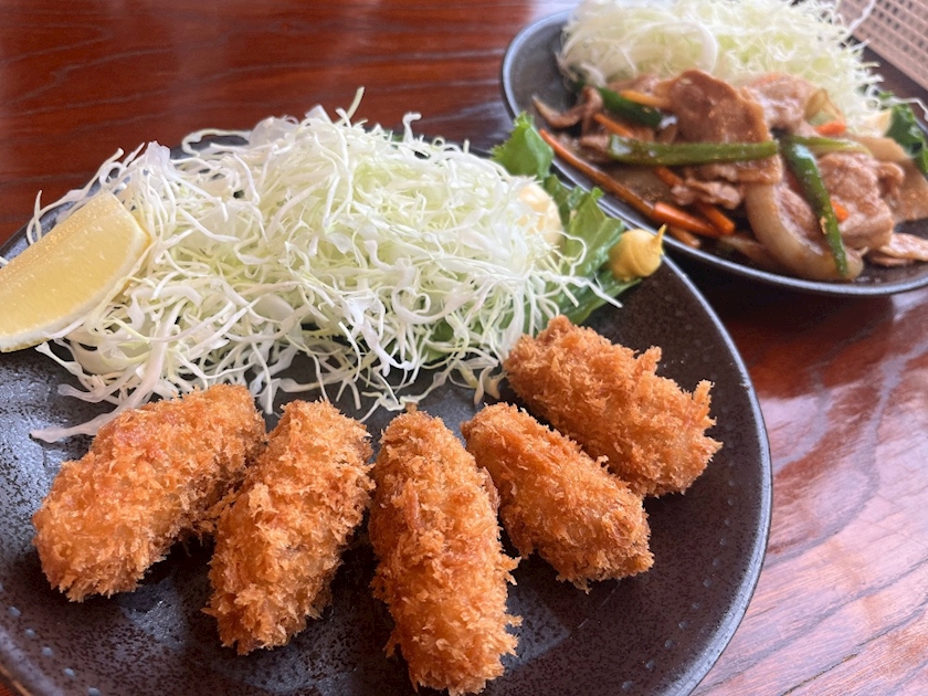 🦪フライと肉炒めたやつ
