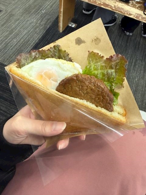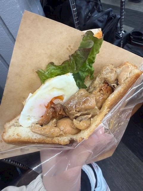 揚げパンにチキンと目玉焼きが入ったやつ!