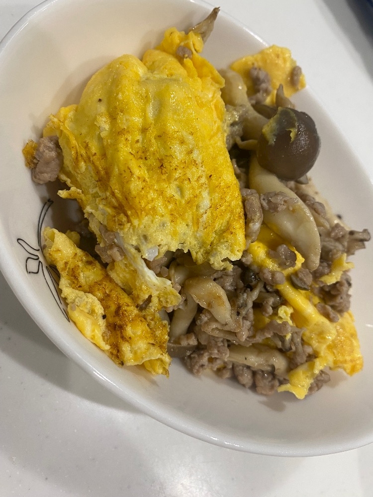 そして、しめじとひき肉のオムレツ作ろうとしたんだけど、卵一個しかなくて失敗😣😲