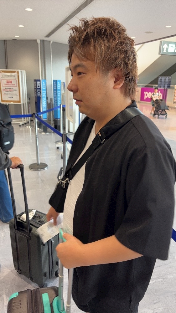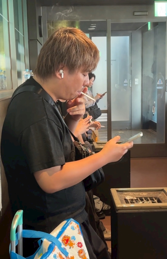 "飛行機降りて念願の喫煙所の