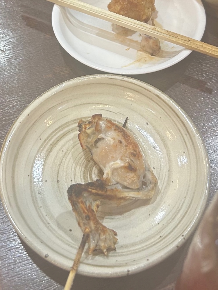 当たり前のようにカエルの串焼きが並んでて