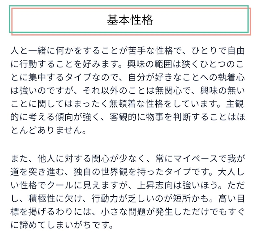 「興味の範囲は狭くひとつのことに集中にするタイプなので、自分が好きなことへの執着心は強いのですが、それ以外のことには無関心で無沈着な性格」