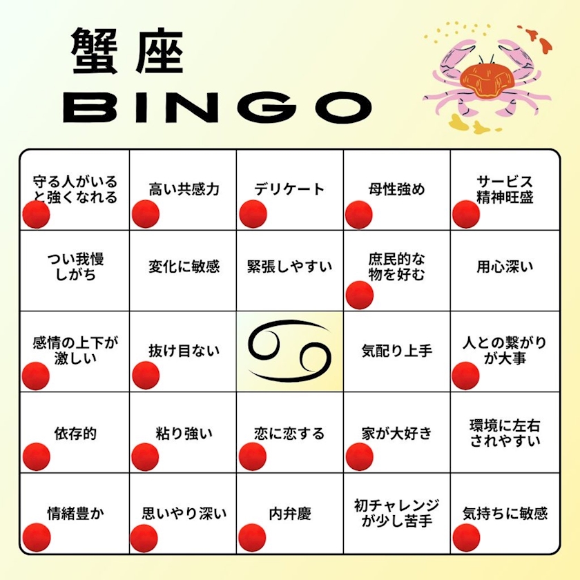 Twitterで見て友達に聞きながらやってみた蟹座ビンゴです。