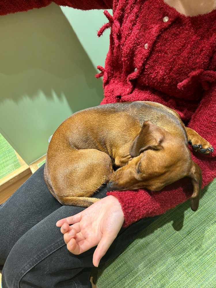この前行った犬カフェにはたくさんの犬種のわんちゃんたちが居たんですけど、その中でもこのダックスちゃんが自分から私の膝の上に乗って来てくれたんです😭