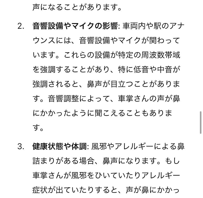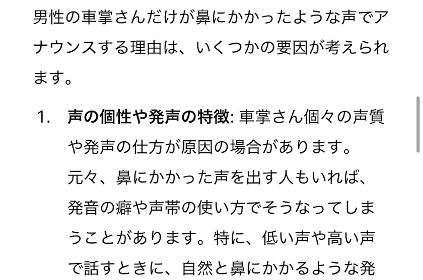 男性の車掌さんが鼻にかかった声で