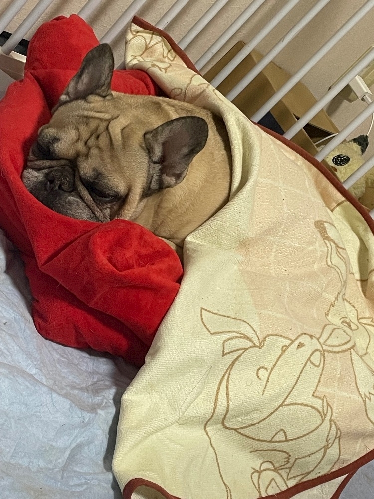 いつも社長は寝る時オムツ外してゲージの中で寝てるんだけど、寒そうだなぁと思って最近は社長お気に入りのメンダコさん入れてブランケットかけてる