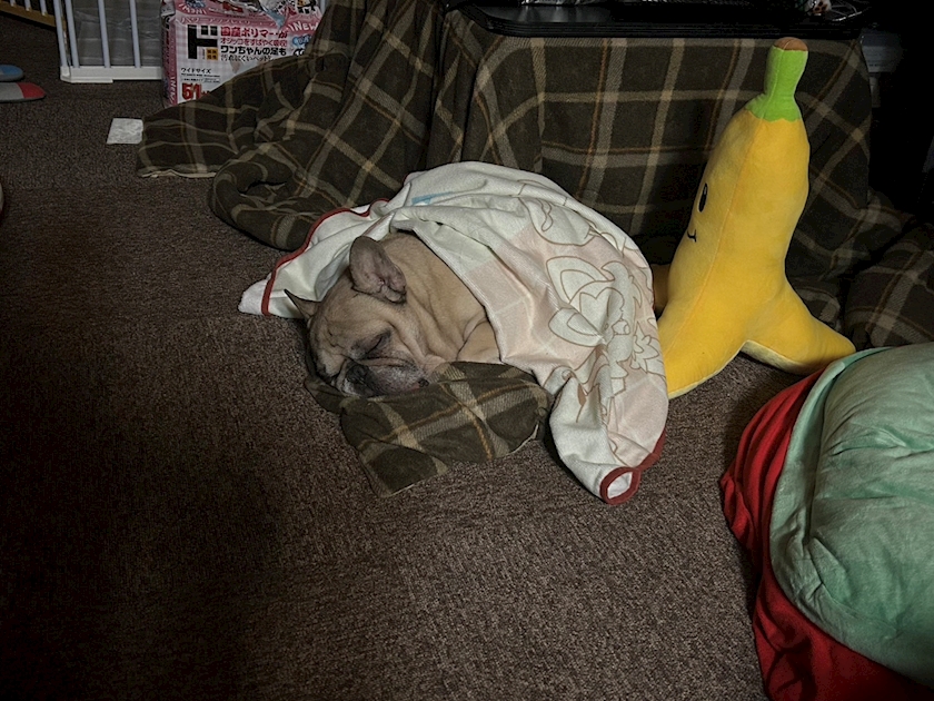 こたつの布団の上で寝ちゃってたからブランケットかけてた