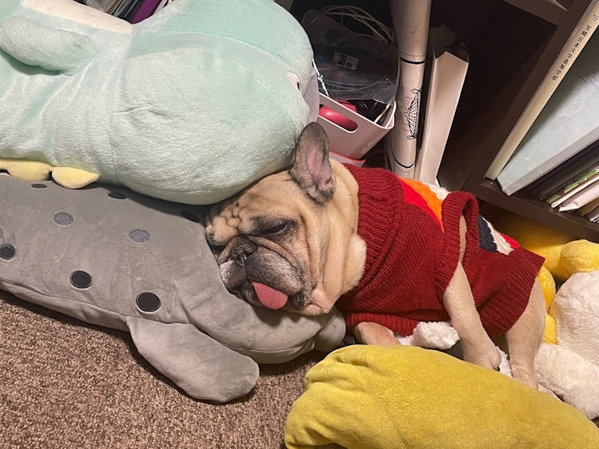 自分がぬいぐるみ大好きで家にいっぱい居るんだけど、前から社長はぬいぐるみに埋もれて寝るのが好きでよく埋もれてたんだけど、セーター着せてから同化してる