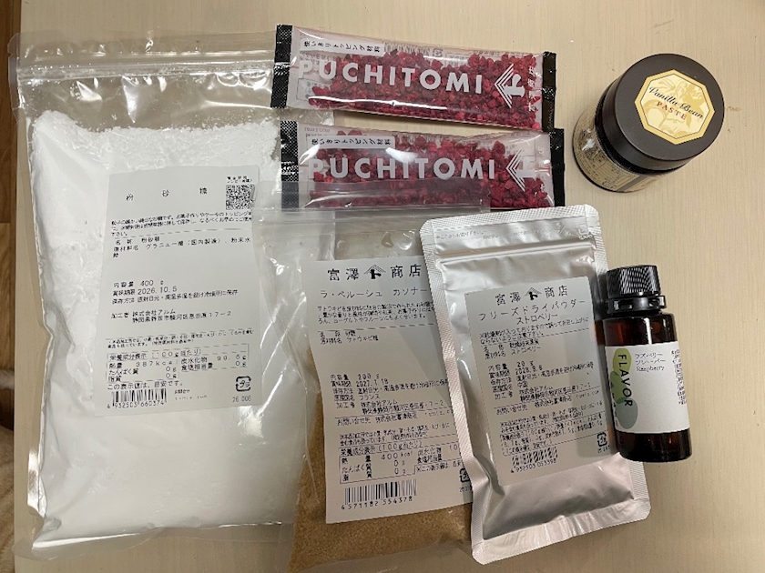 粉糖とカソナードとドライフランボワーズとドライストロベリーパウダーとバニラビーンズペーストとラズベリーフレーバー