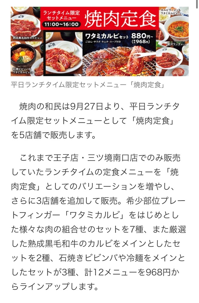 「焼肉の和民」平日限定「焼肉定食ランチ」を5店舗で展開。ご飯おかわり無料でボリューミー