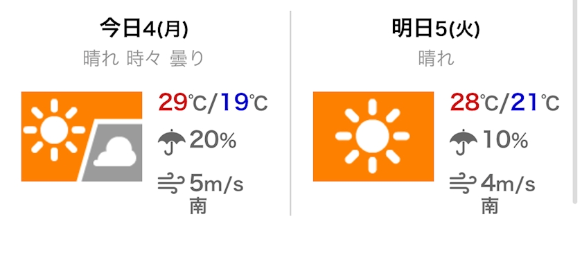 最高気温は29℃の予報です。