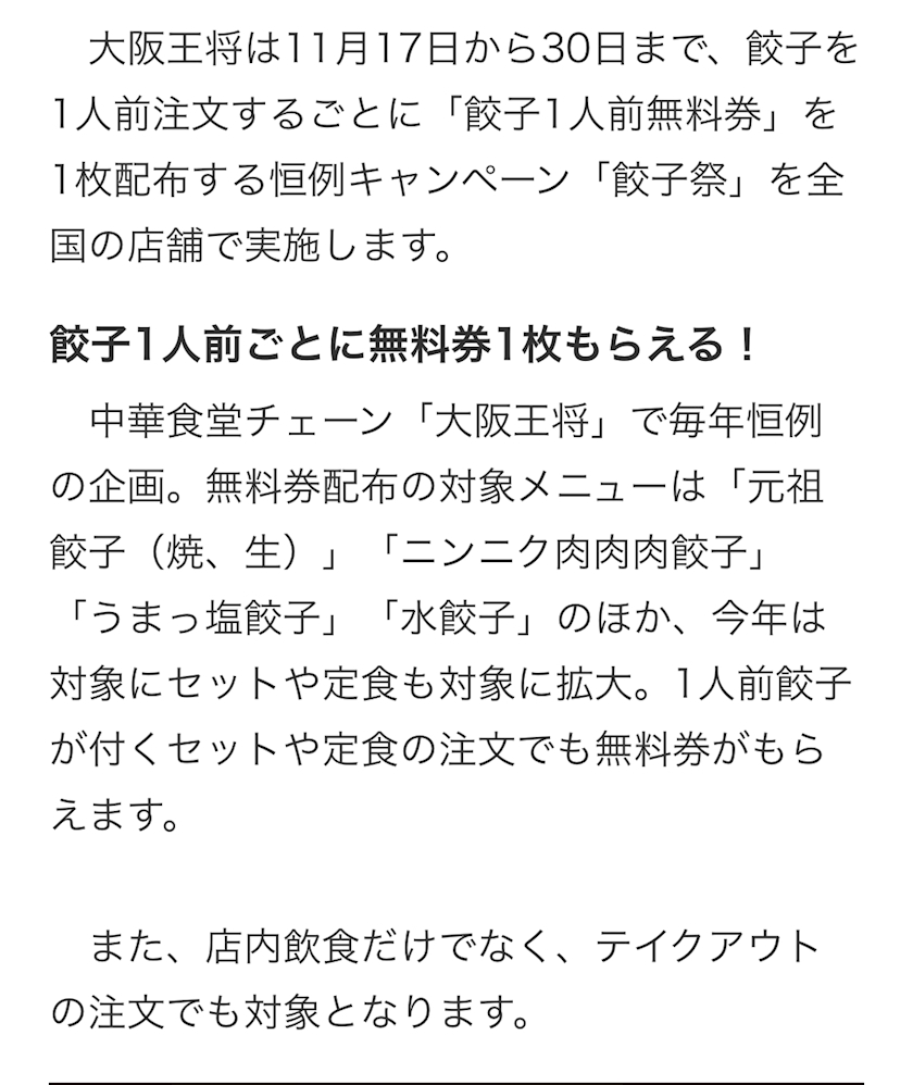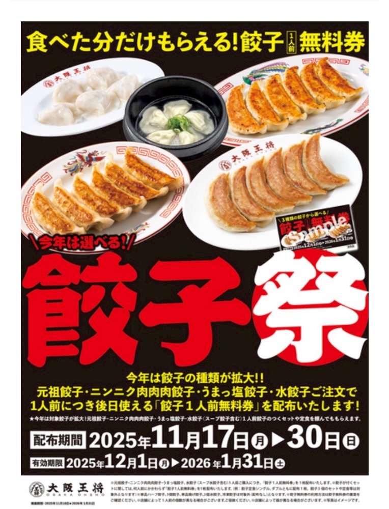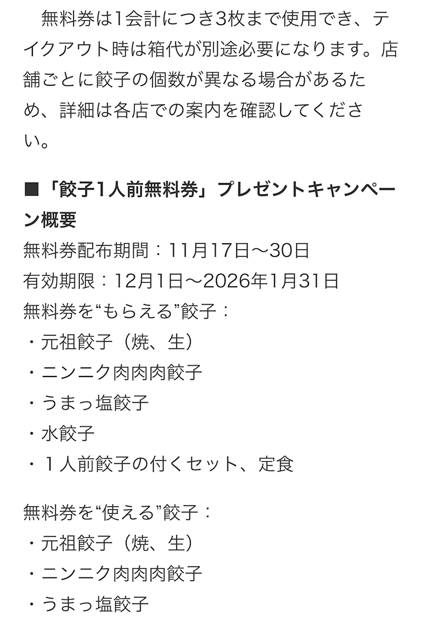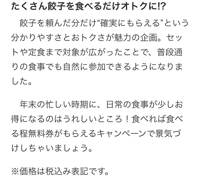 「餃子」を食べて「無料券」がもらえる!