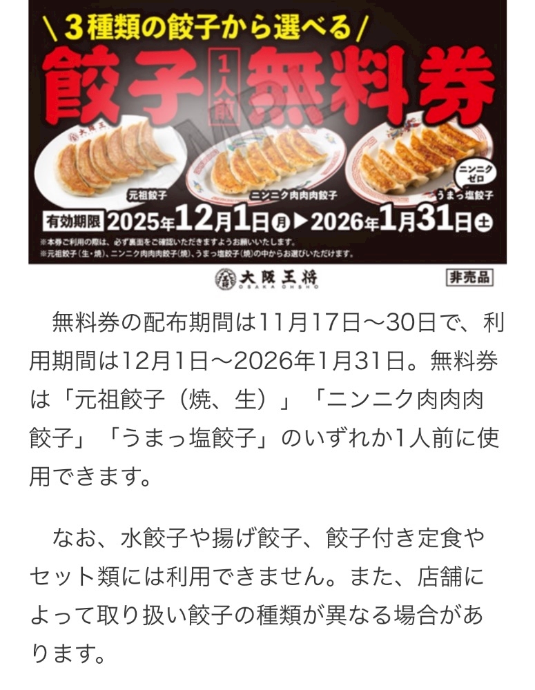 「餃子1人前無料券」を1枚配布する
