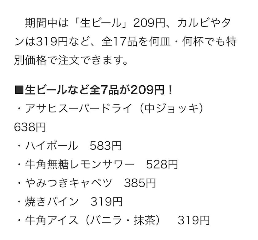 生ビール209円、カルビ319円!