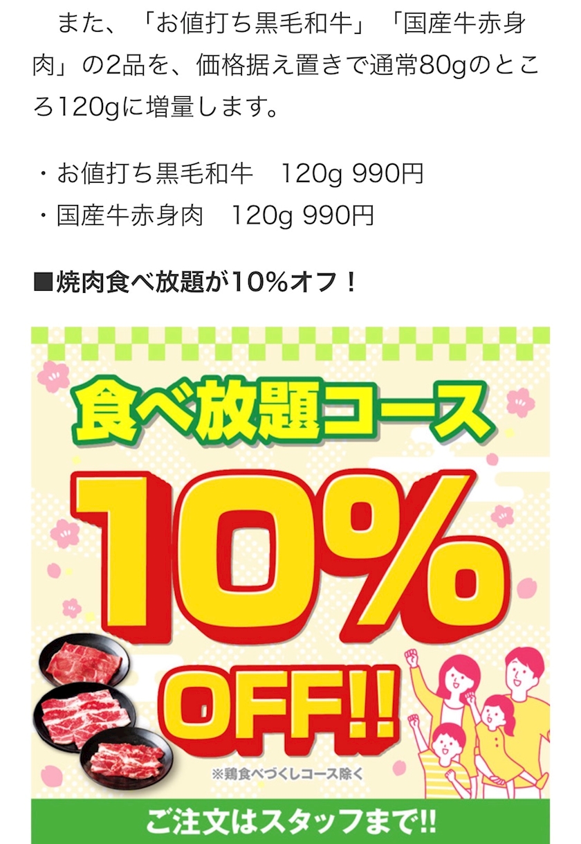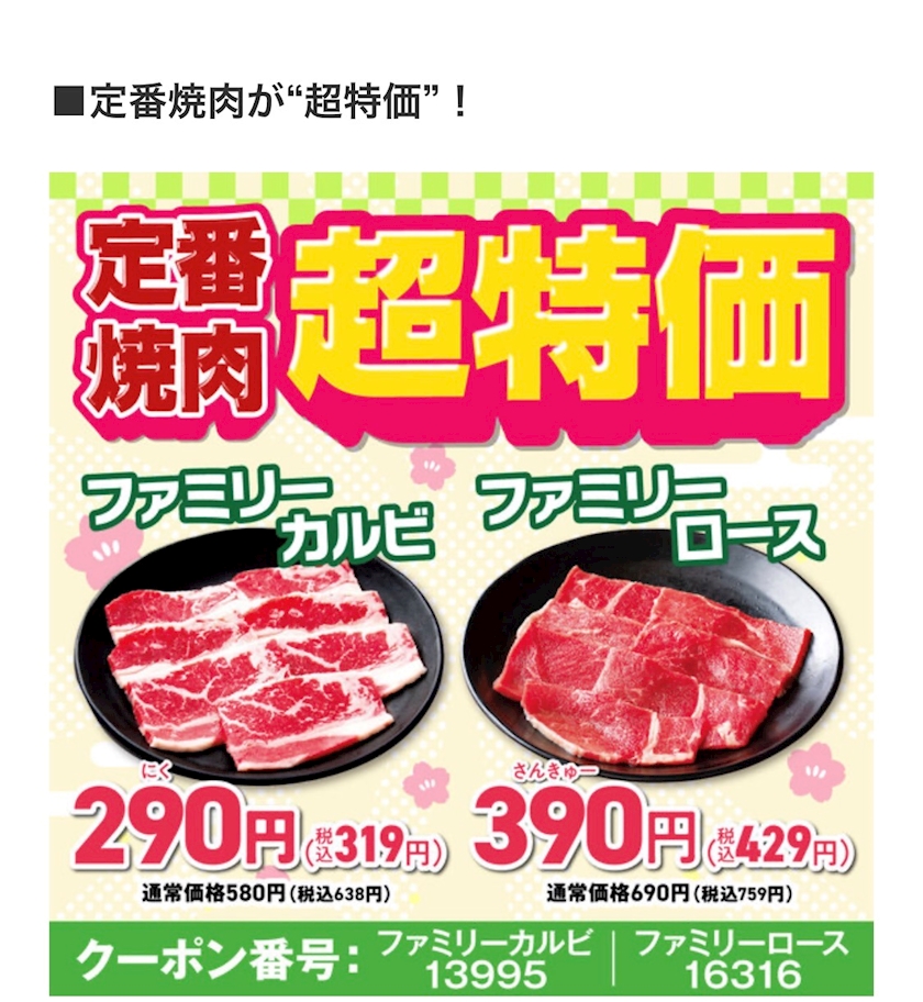 カルビ319円、1.5倍の増量メニューも!