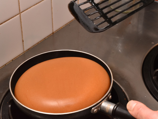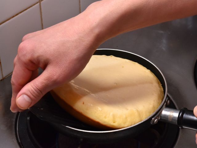 約8分焼いた後、裏返して、約3分蓋をして蒸らす。その後、裏返してから弱火で約4分蓋をして焼き、最後に裏返して蓋をせずに弱火で約4分焼き、焼き印を押したら完成だ。