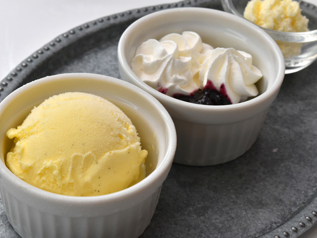 (写真手前から)「バニラアイス」(200円)、「ホイップクリームとブルーベリーソース」(150円)、「ホイップバター」(150円)でオーダーできるトッピングも用意