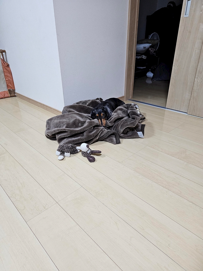 寝室を勝手にあけ、お気に入りの布団を持ち出す