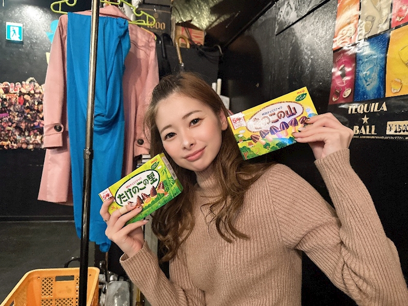 きのことたけのこを持って