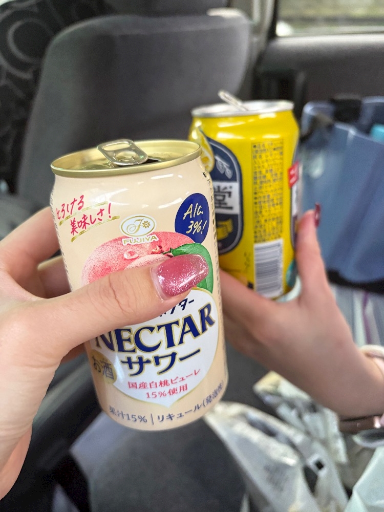 行きの車であいさんと朝からカンパイ🎶