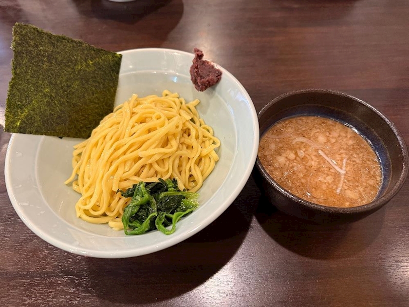 魚介スープひたひたに浸した麺を