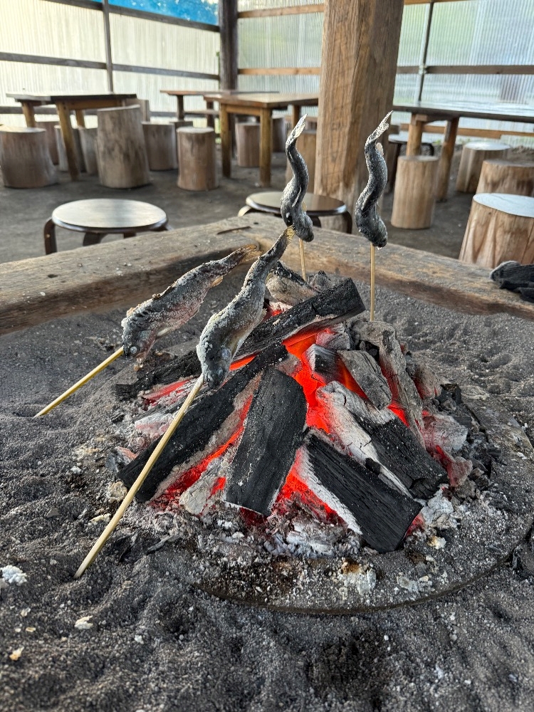 釣ったマスはそのまま炭火で焼いてくれるの🔥
