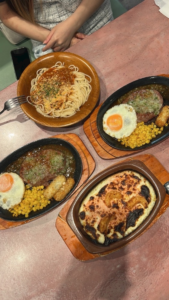 パスタとハンバーグ食べて